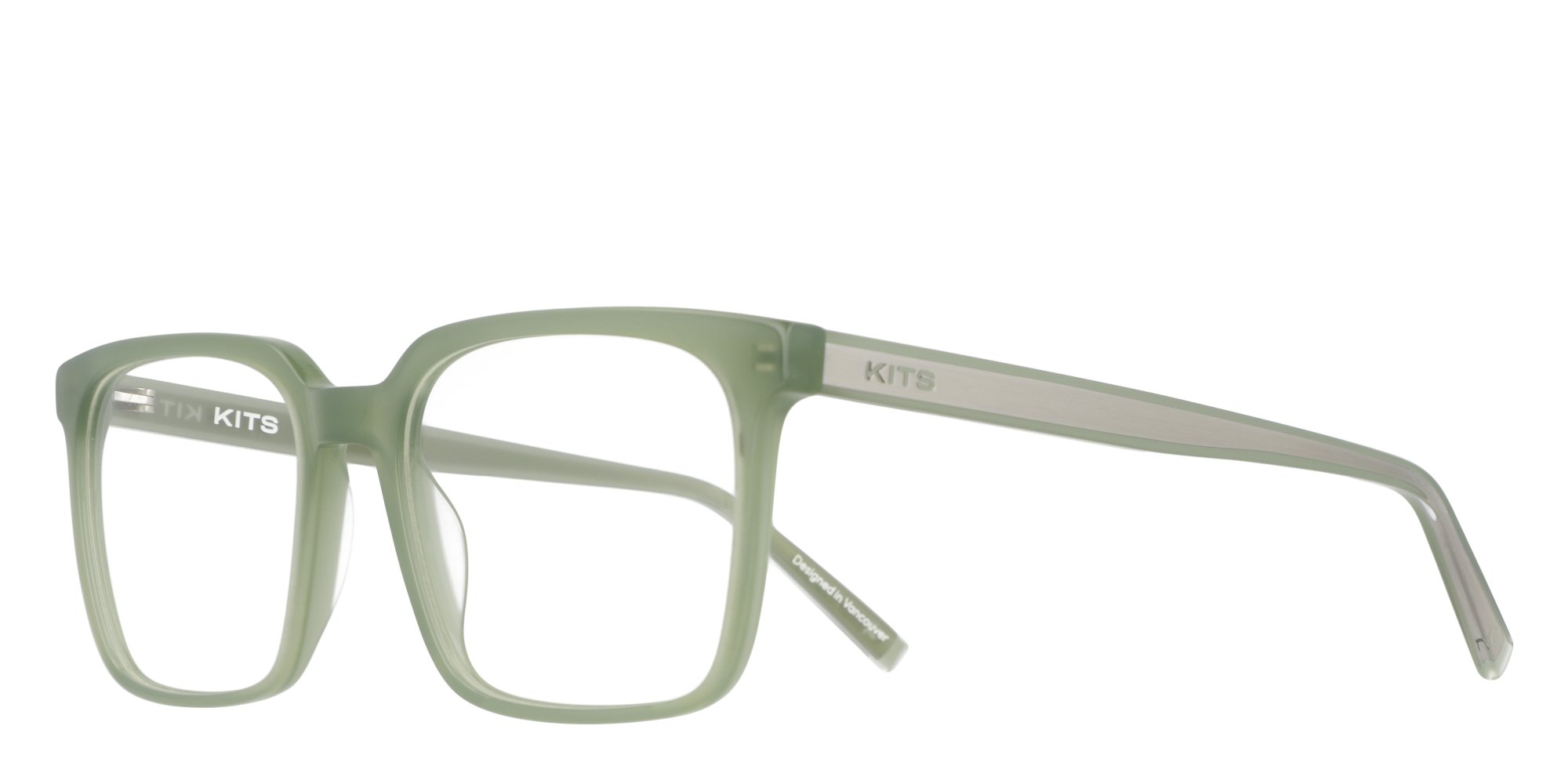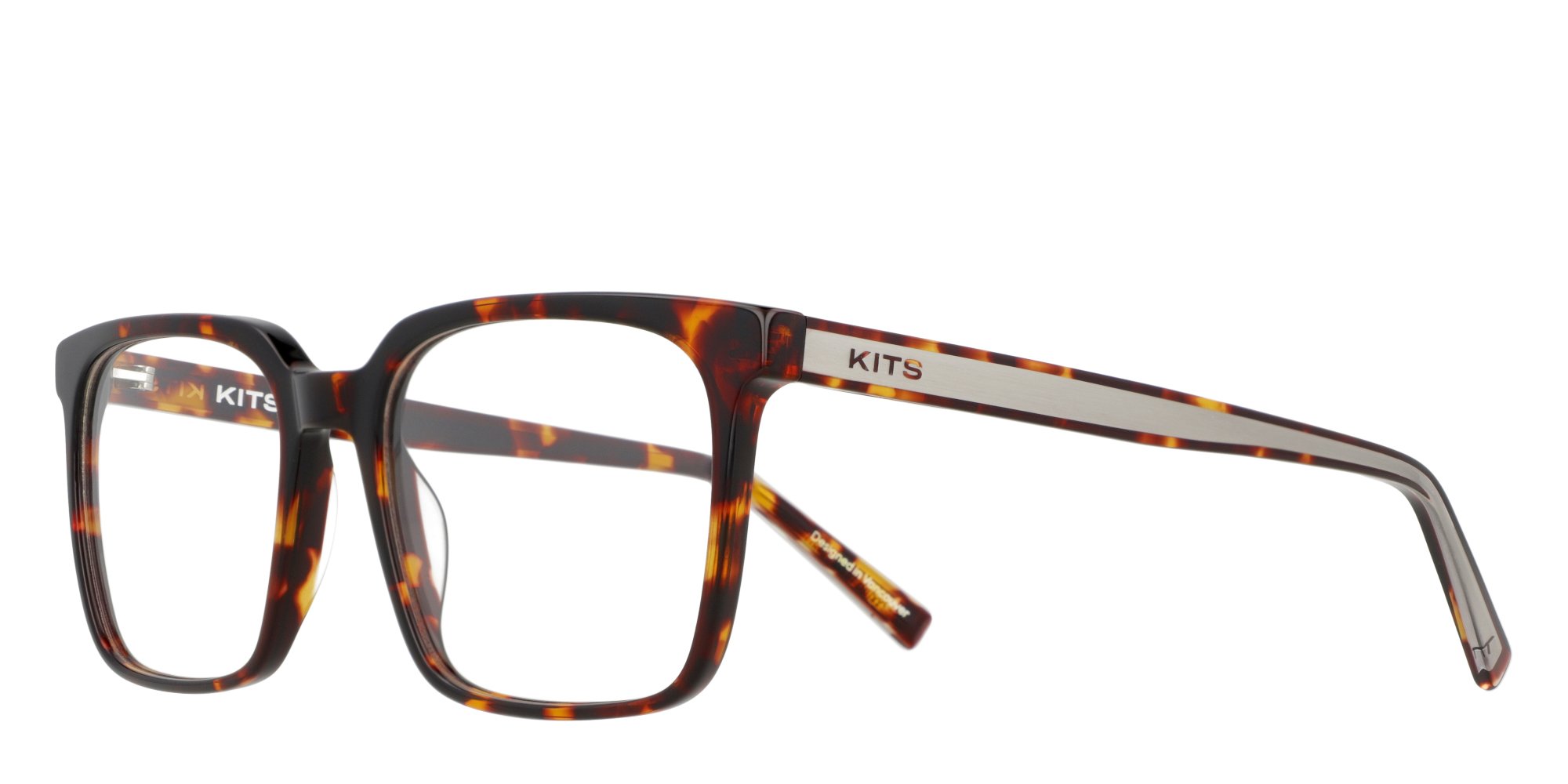 - Unique temple detail: embedded metal plate with KITS logo
